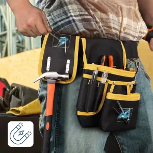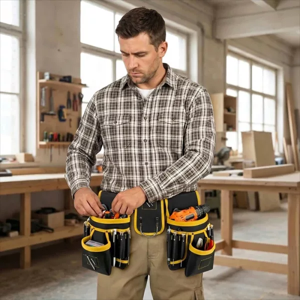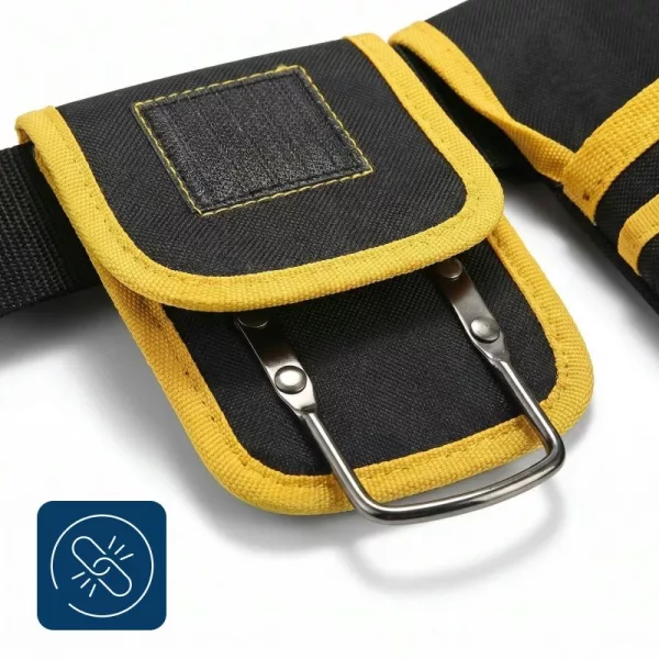 Uso questa cintura quando installo i mobili da cucina. Tengo viti, punte, matita e livella separati, così non devo frugare, e la fascia in vita è morbida.