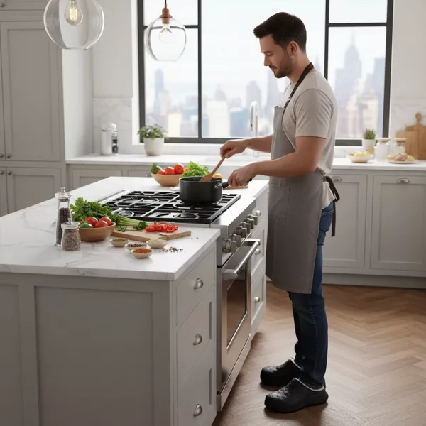 Lo strato esterno respinge i liquidi per mantenere i piedi asciutti e puliti. Nessuna preoccupazione per schizzi in cucina o in corridoio.