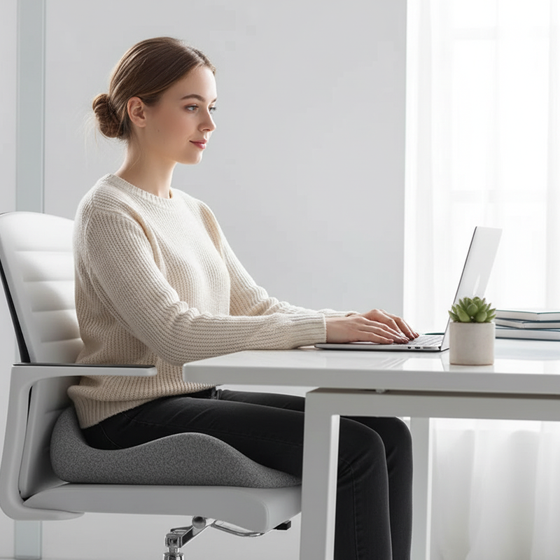 Sono felicissima di questo cuscino per il coccige! I miei fianchi sono contenti e siedo molto più dritta. Non scivola mai, anche se mi muovo molto alla scrivania.