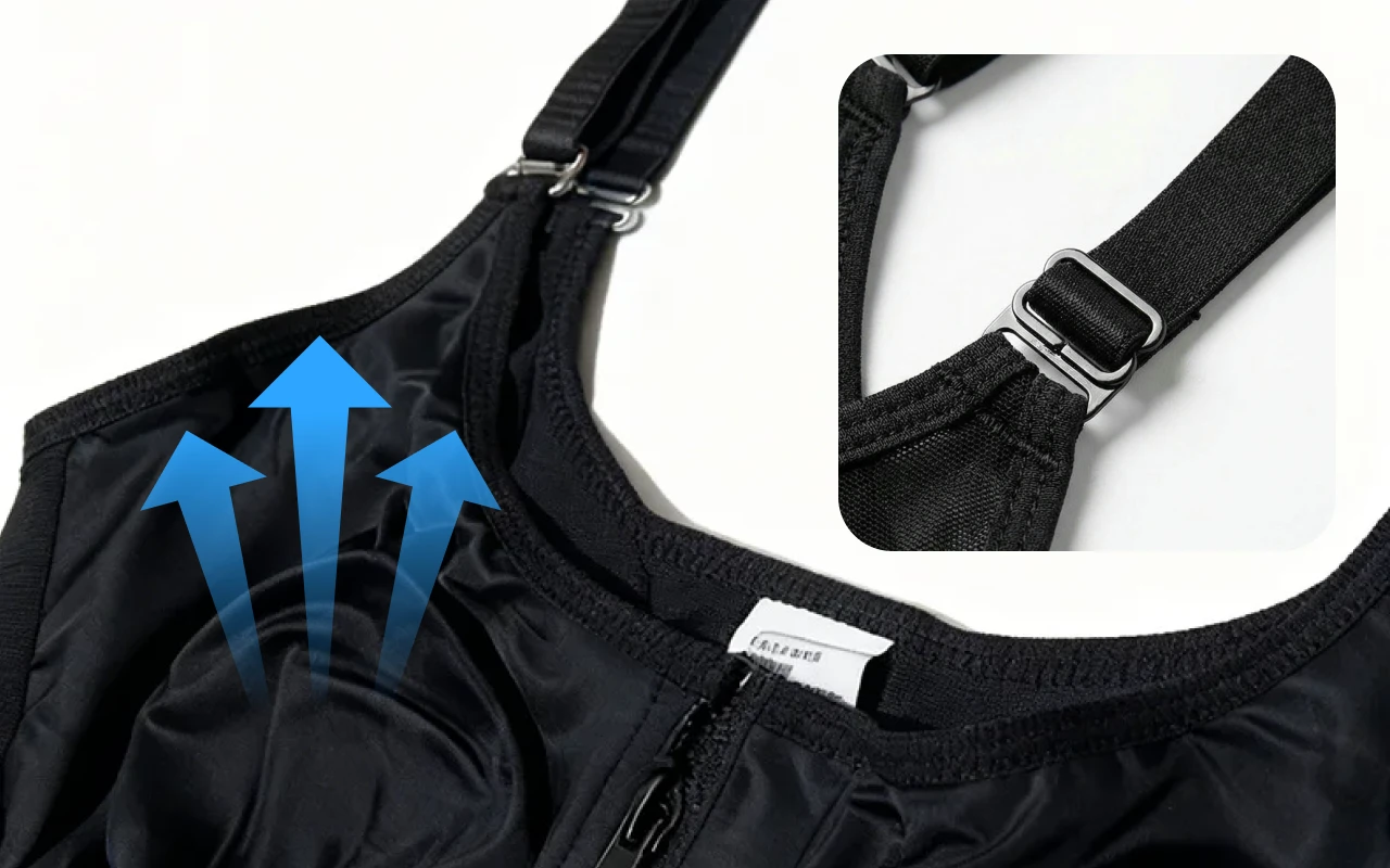 Il tessuto morbido lascia respirare la pelle mantenendo una sensazione di sicurezza. Le spalline regolabili garantiscono una vestibilità perfetta per ogni corporatura.