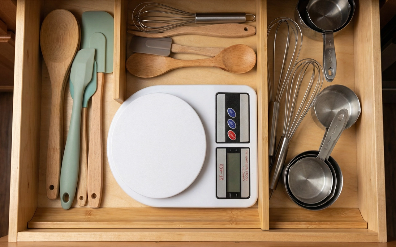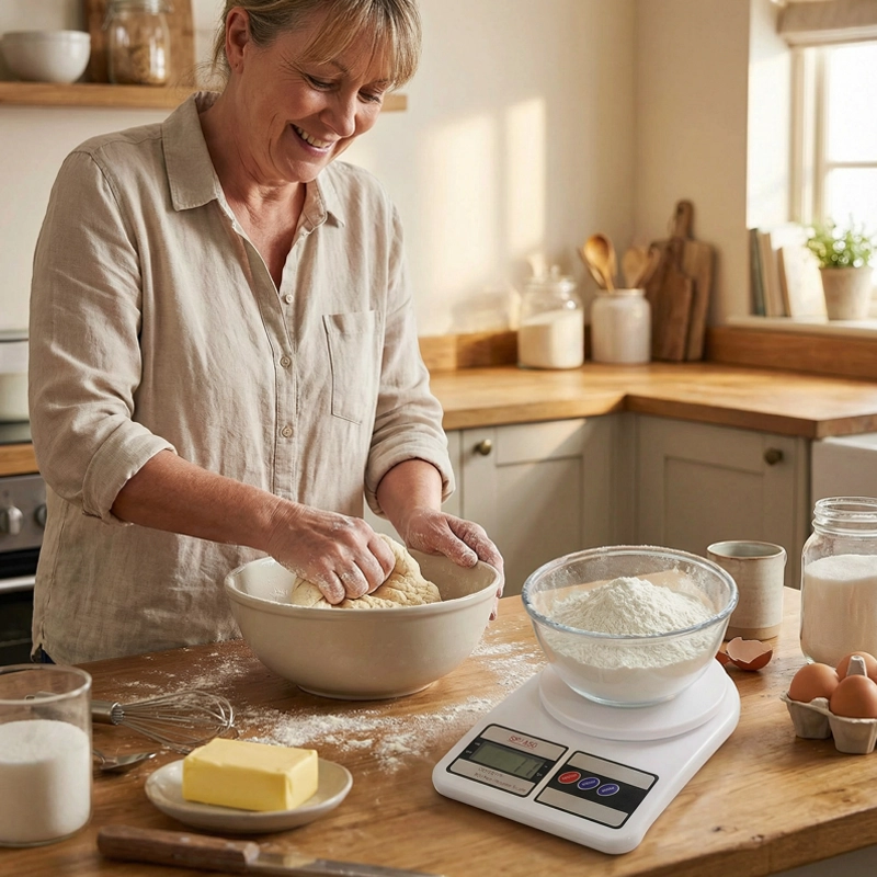 La uso nella mia piccola cucina dell’appartamento. Leggera ma sembra davvero solida. Sopporta ciotole pesanti senza problemi. Numeri facili da leggere.