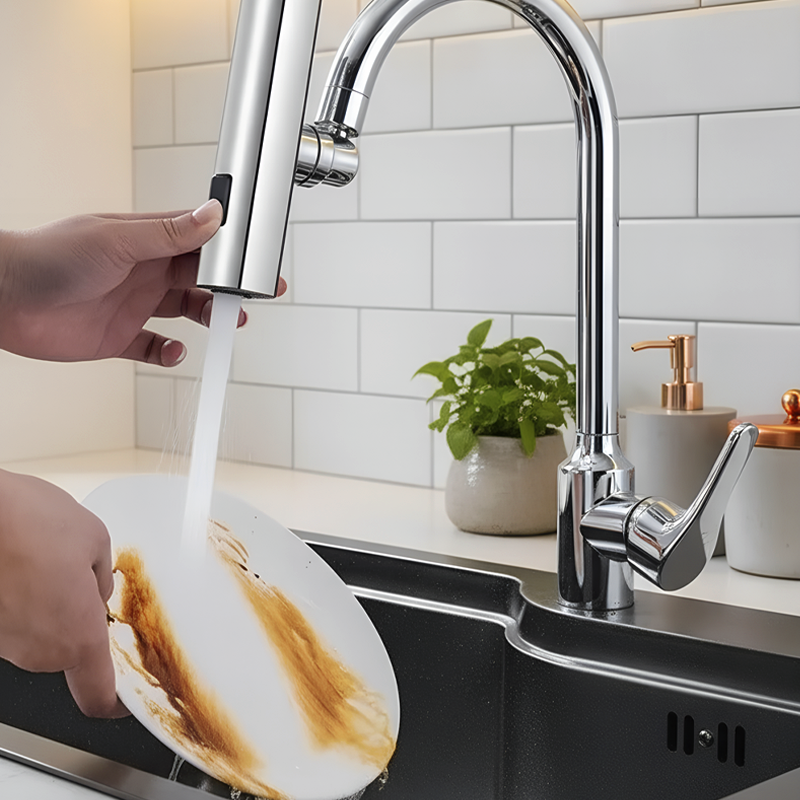 Passa tra getto morbido, potente o ampio per ogni necessità. Risparmiare acqua è semplice mentre i piatti tornano splendenti.
