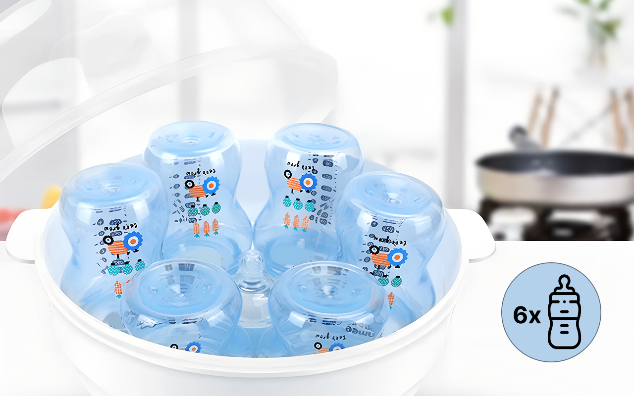 Sei biberon si inseriscono insieme in un unico e semplice ciclo di vapore. Perfetto per giornate impegnative o famiglie con più di un bambino.