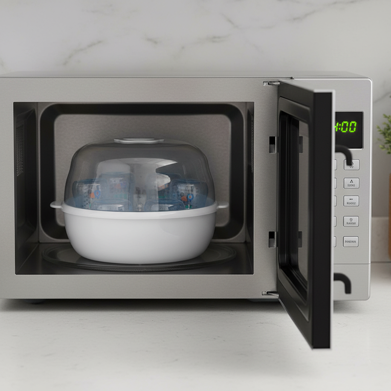 Basta riempirlo con le bottiglie, aggiungere acqua e microonde—fatto. Sembra anche sicuro, visto che la plastica è senza BPA. Davvero soddisfatto.