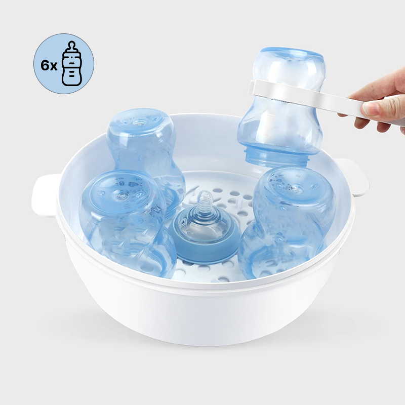 Sei biberon si inseriscono insieme in un unico e semplice ciclo di vapore. Perfetto per giornate impegnative o famiglie con più di un bambino.
