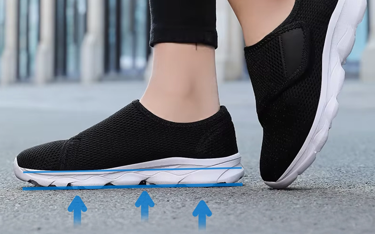 Ogni passo è morbido grazie al design flessibile della suola. Talloni e arcate doloranti vengono delicatamente supportati durante la camminata all'aperto.