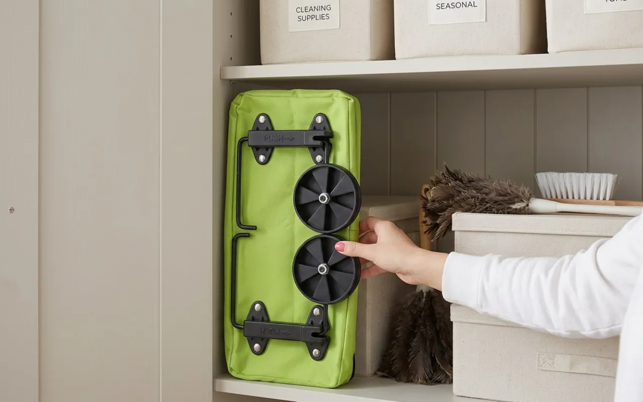 Ho preso questo carrello dopo un’operazione alla spalla. Ora carico bottiglie pesanti e frutta senza preoccuparmi. Si piega in pochi secondi e scivola facilmente accanto all’armadio.