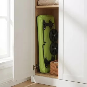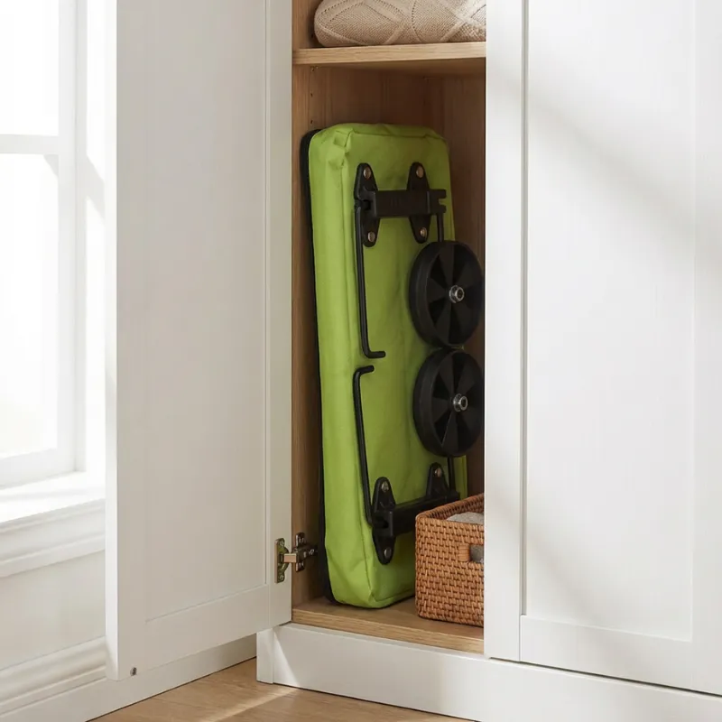 Il carrello si ripiega in un fascio sottile che entra negli armadietti stretti. Il corpo leggero si appende ordinatamente dietro le porte, liberando prezioso spazio nel corridoio.