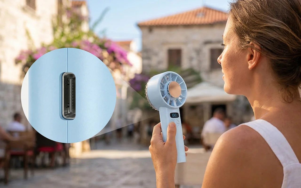 Ho portato questo ventilatore rinfrescante a un festival estivo. Leggerissimo, entra nella tasca dei pantaloncini e il LED chiaro mi indicava esattamente quanta carica avevo ancora.