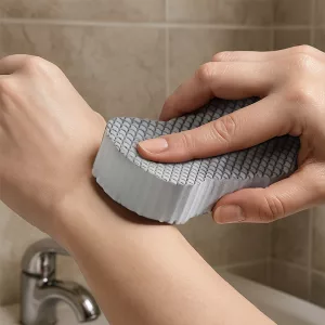Mai sentito prurito o rossore dopo aver usato questo scrubber. La mia pelle si sente fresca ogni volta e si appende bene in bagno.