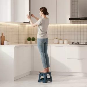Uso questo sgabello ogni giorno per raggiungere gli scaffali alti in cucina. Si piega facilmente e si infila sotto il lavello, davvero comodo.