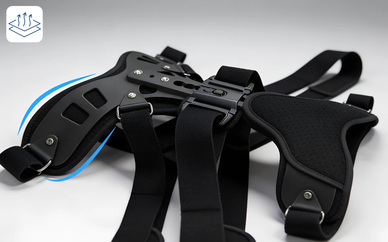 Materiali traspiranti permettono alla pelle di restare fresca e asciutta. Piastre leggere e aste di supporto offrono comfort duraturo ovunque.