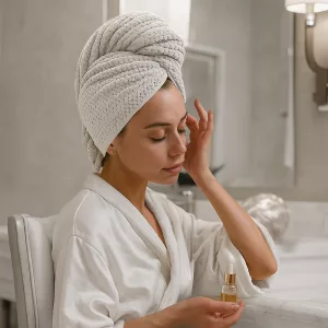La fascia elastica mantiene tutto in posizione senza scivolare. Muoviti liberamente in casa mentre i tuoi capelli restano avvolti e protetti.