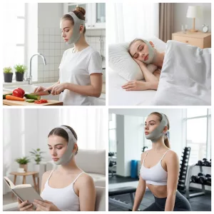 Indossare questa fascia per la mascella di notte è delicato e leggero. Mi sveglio ogni mattina amando la differenza che vedo sul mio viso.