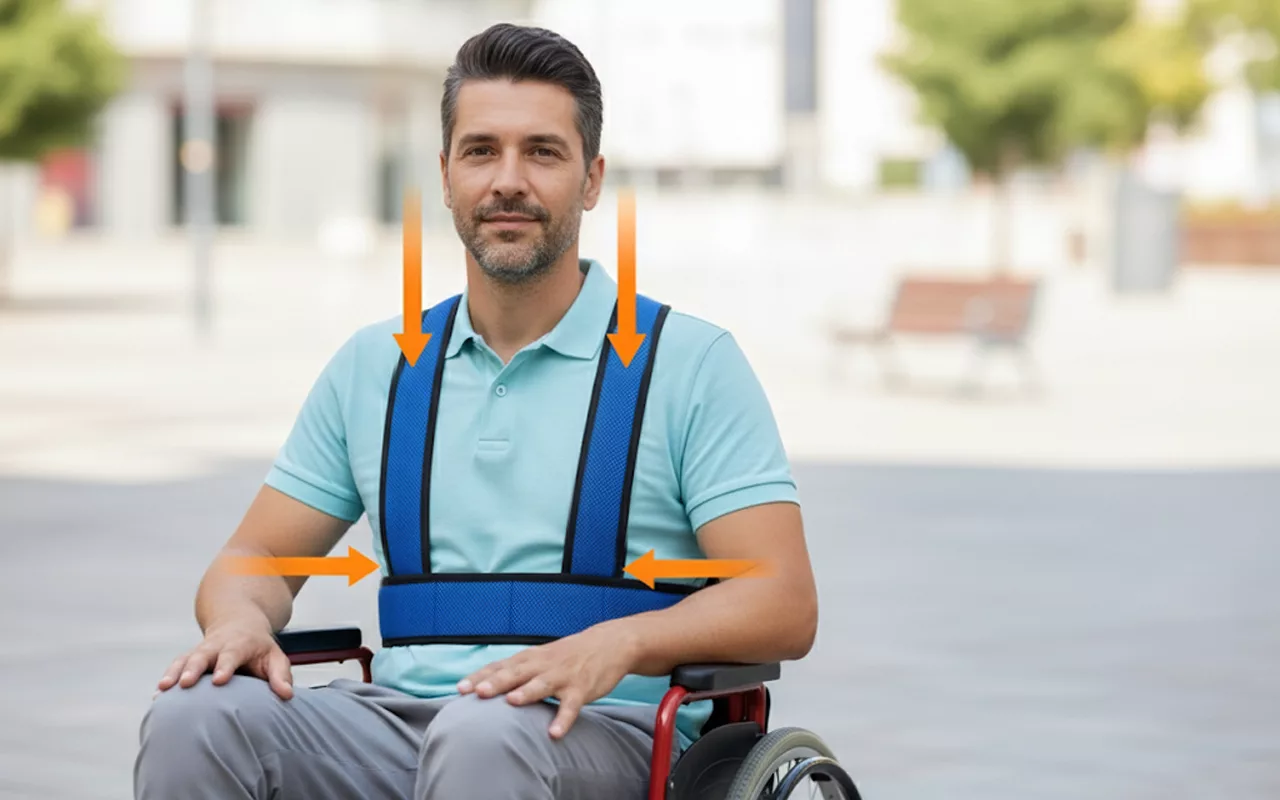 Le cinghie sulle spalle mantengono la persona dritta e stabile durante l’utilizzo. Questo aiuta a prevenire pericolose scivolate o inclinazioni in avanti sulla sedia.