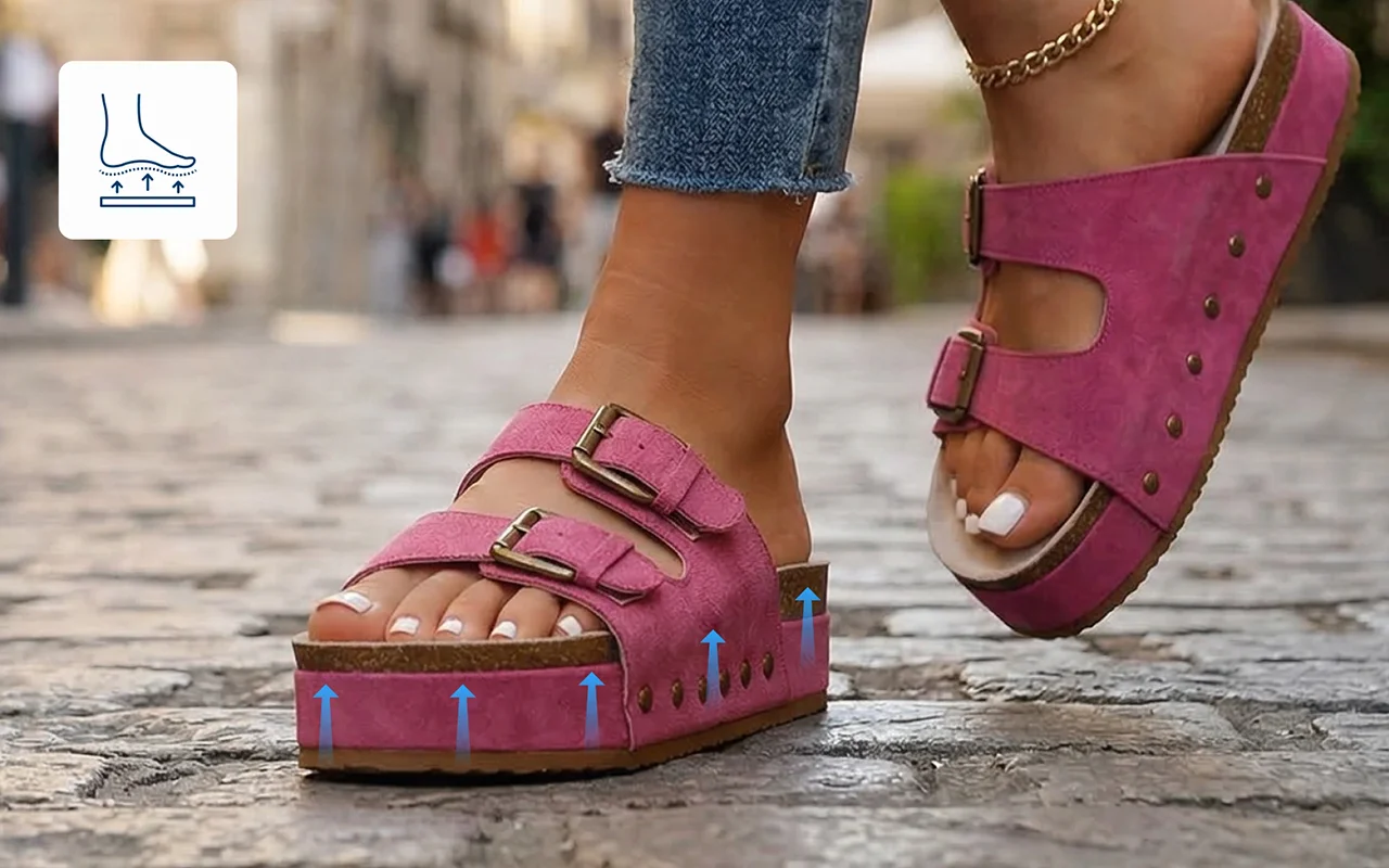 La spessa zeppa assorbe la pressione e riduce rapidamente la stanchezza. Rimani attiva più a lungo senza archi doloranti o talloni indolenziti.