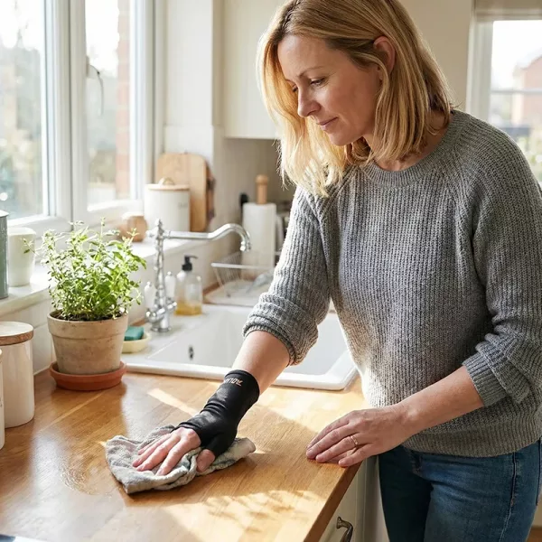 Il tessuto elasticizzato e traspirante avvolge delicatamente la mano per un comfort che dura tutto il giorno. Niente pizzicori o scivolamenti, garantisce un supporto costante per tutto il tempo d’uso.