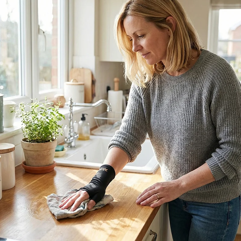 Il tessuto elasticizzato e traspirante avvolge delicatamente la mano per un comfort che dura tutto il giorno. Niente pizzicori o scivolamenti, garantisce un supporto costante per tutto il tempo d’uso.